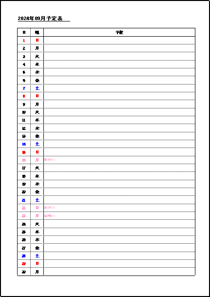 2024年のシンプルなカレンダー書式の、月予定表です。ダウンロードしてビジネスや勉強などでご利用ください。